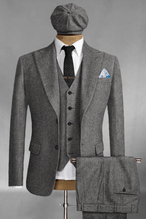 Modern Gray 3 Pieces Peaked Lapel Wool Business Men Suits
