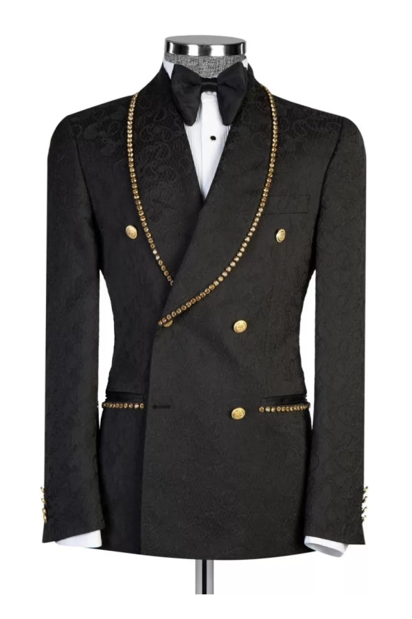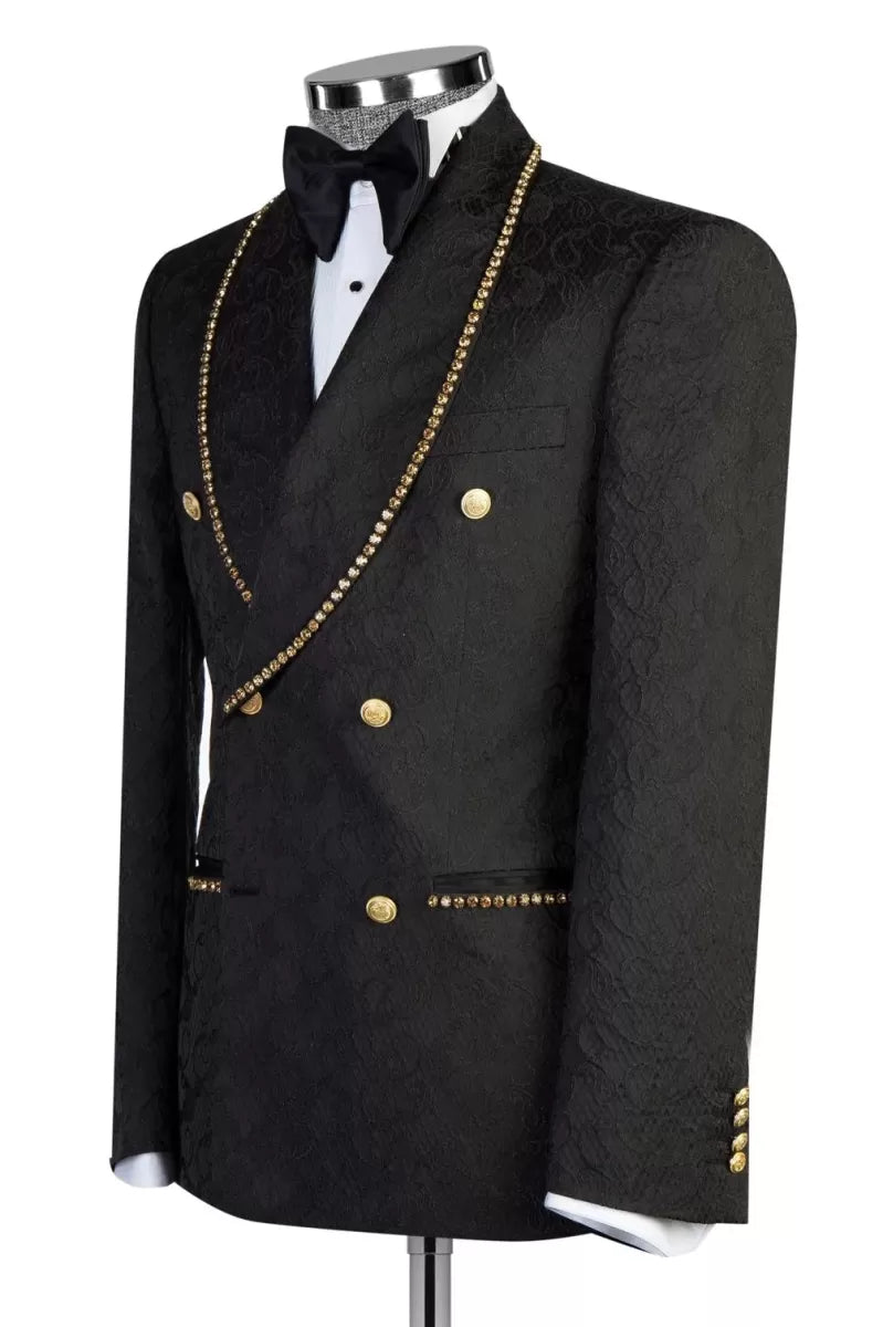 Black Jacquard Double Breasted Shawl Lapel Beadings Wedding Suits