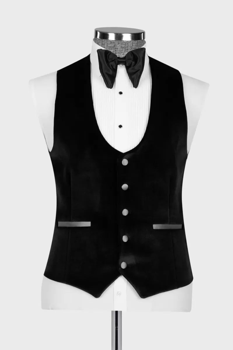 Black Velvet Double Breasted Silver Satin Shawl Lapel Wedding Suits With Belt