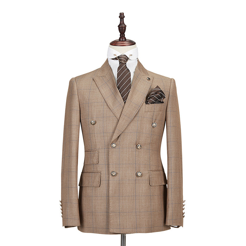 Chic Khaki Newest Plaid Peaked Lapel Business Men Suits